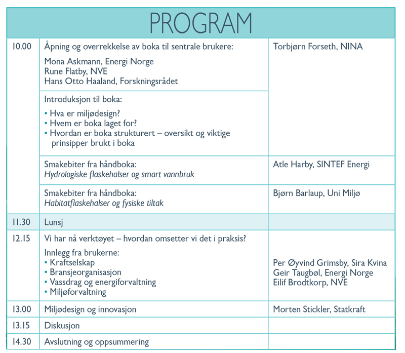 Boka er myntet på vassdragsforvaltere, energiselskaper og andre interessegrupper knyttet til vassdrag. Boka lanseres for våre brukere og interessenter den 19. september, og vi inviterer med dette til en fagdag med fokus miljødesign i praksis!