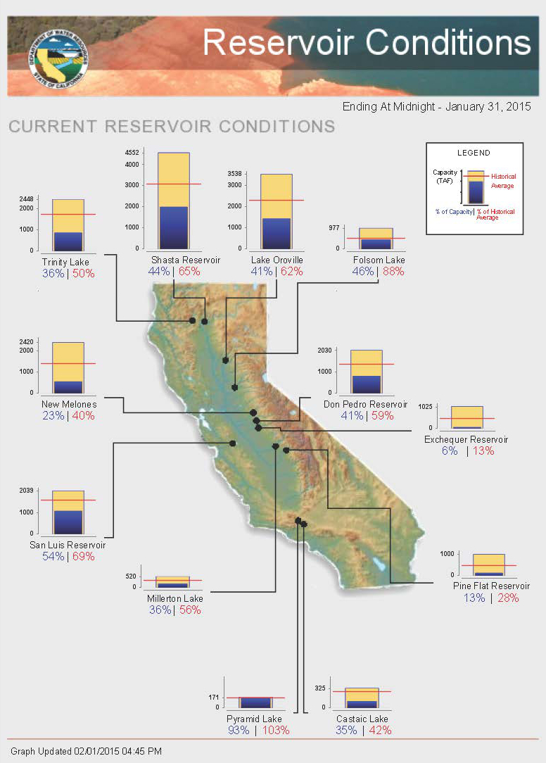 Figur: Vannivå i sentrale magasin i vassdraget Sacramento-San Joaquin i California pr utgangen av januar 2015. De blå tallene viser fyllingsgrad i forhold til lagringskapasitet, mens de røde tallene viser vannstand ved utløpet av januar 2015 i forhold til normal vannstand på denne tiden av året. Kilde: California Department of Water Resources.